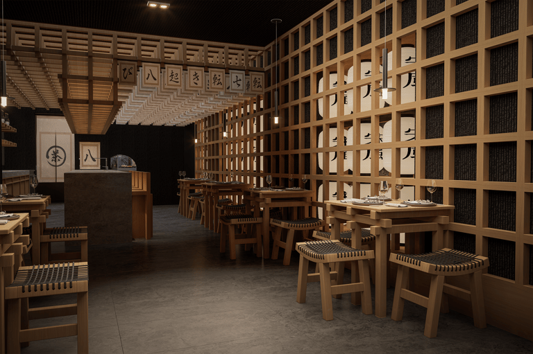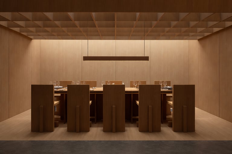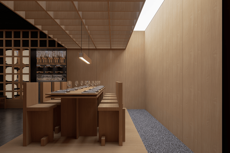 El diseño interior se apoya en una paleta neutra y cálida dominada por la madera natural, en distintos tonos y tramas, que envuelve el espacio con una sensación de calma y recogimiento. Los muros y celosías de madera reinterpretan la arquitectura tradicional japonesa a través de una retícula modular que estructura el ambiente y genera ritmo visual. Esta trama ortogonal no solo ordena el espacio, sino que también funciona como filtro, permitiendo transparencias sutiles y juegos de luz y sombra que evocan la poética del wabi-sabi: la belleza de lo simple, lo imperfecto y lo esencial.