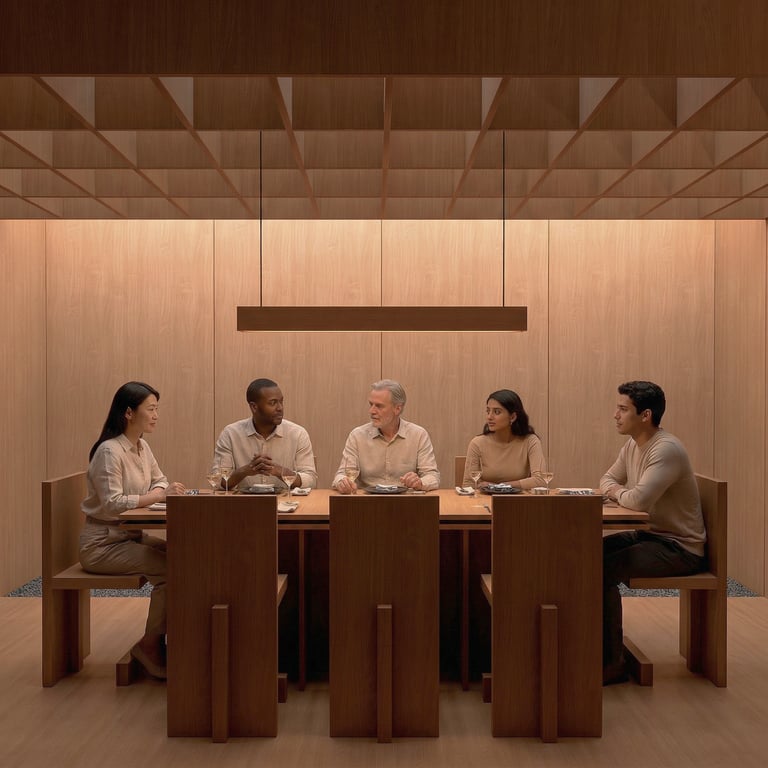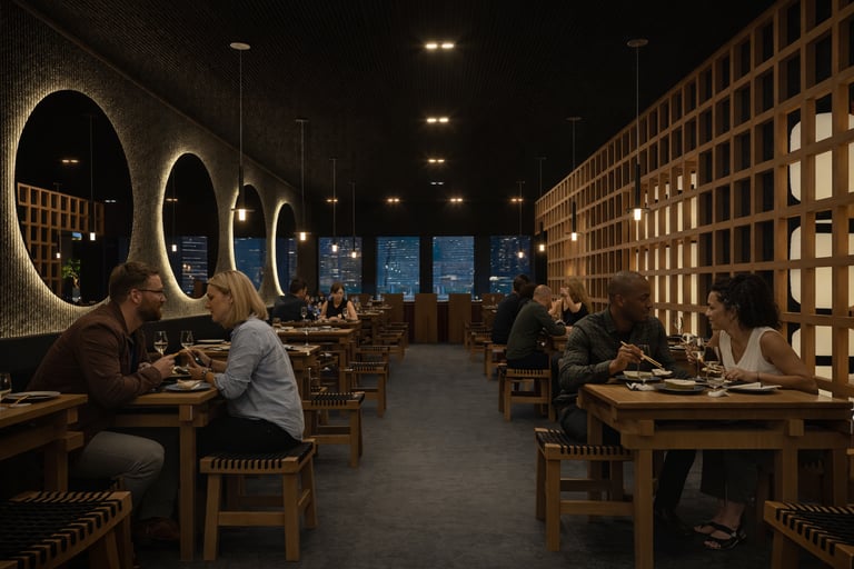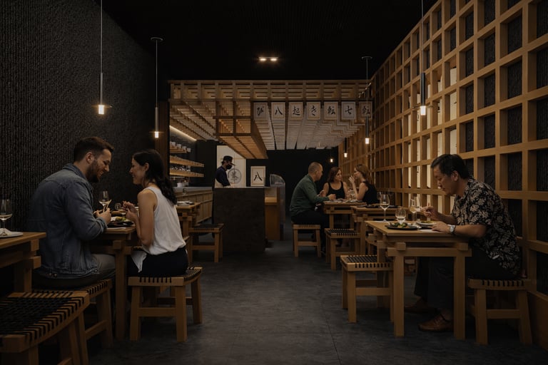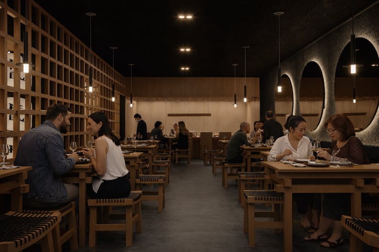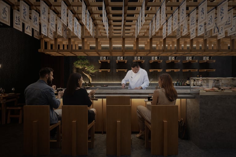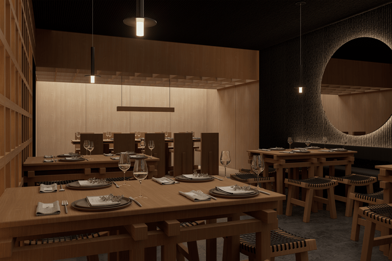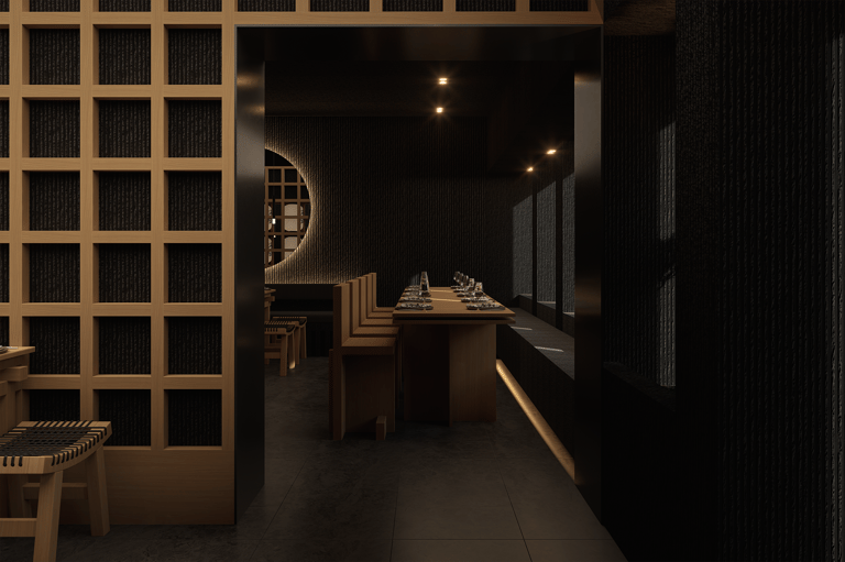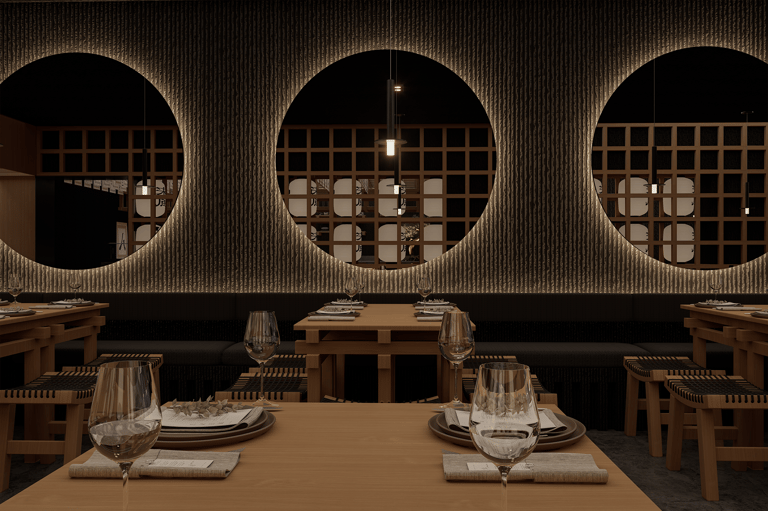 El cielo raso oscuro contrasta con la calidez del mobiliario, reforzando la atmósfera introspectiva. La iluminación, cuidadosamente dirigida, se convierte en protagonista: luminarias lineales sobre la mesa privada y piezas colgantes puntuales sobre las mesas principales crean islas de luz que resaltan la experiencia culinaria. Cada plato se ilumina como una obra, destacando texturas, colores y detalles propios de la fusión nikkei.