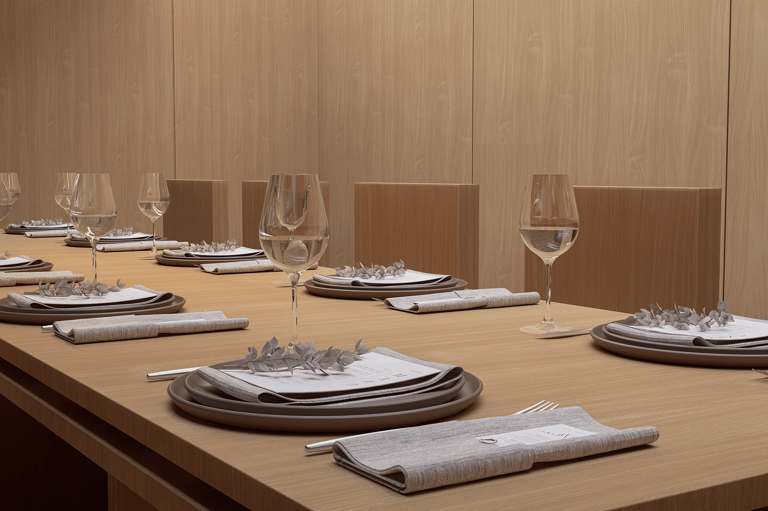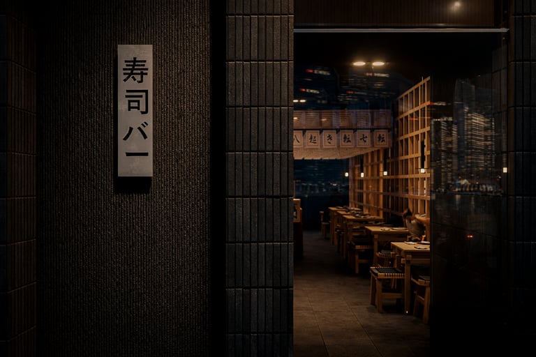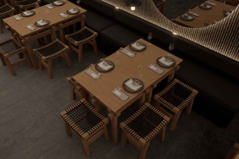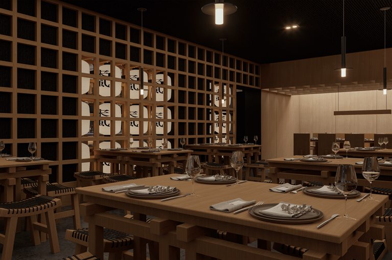 El espacio se organiza en tres momentos: el salón principal, la barra de sushi y un comedor más íntimo al fondo. En el salón, mesas macizas de madera sólida y bancos tejidos con acentos oscuros transmiten robustez y honestidad material. La disposición ordenada y simétrica refuerza la idea de disciplina y precisión, valores asociados tanto a la cocina japonesa como a la alta gastronomía.