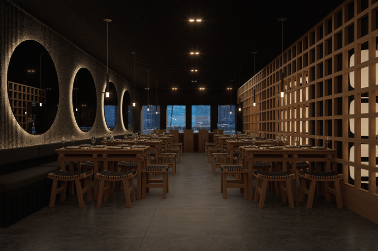 HAI no busca ser un restaurante temático, sino una interpretación contemporánea de dos culturas que dialogan a través del fuego y el sabor. La ceniza como concepto se traduce en una estética sobria, refinada y atemporal. Es un espacio que invita a la contemplación, donde cada textura, cada sombra y cada línea responden a una narrativa clara: después del fuego, queda la esencia.