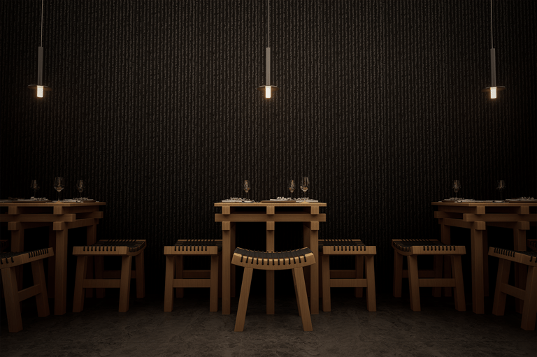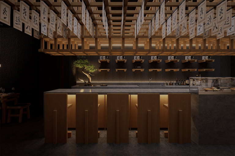 La barra se convierte en el corazón del restaurante. Suspendida sobre ella, una estructura de madera alberga piezas gráficas con caracteres japoneses que aportan identidad y profundidad cultural. Detrás, un bonsái cuidadosamente iluminado introduce un gesto natural que equilibra la composición y simboliza la armonía entre técnica y naturaleza. El concreto texturizado del mostrador añade un matiz mineral, evocando justamente la ceniza, y genera un contraste táctil con la calidez de la madera.