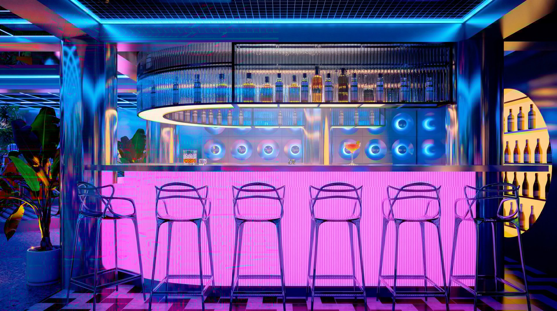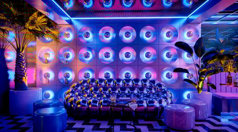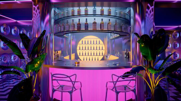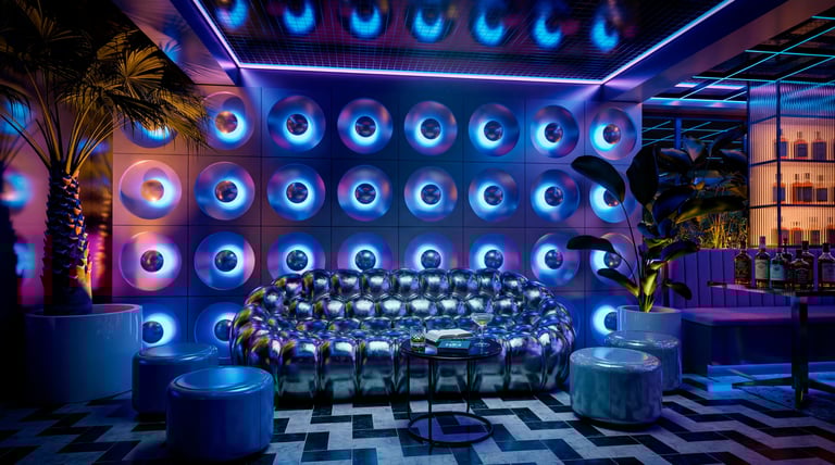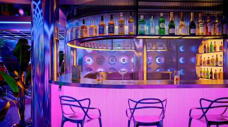 El corazón del diseño es una barra central circular, concebida como un objeto escultórico y punto de gravedad espacial. Su iluminación rosada difusa, integrada en el perímetro, no solo define su geometría, sino que actúa como fuente lumínica primaria, bañando el entorno con un resplandor cálido que dialoga con los tonos fríos del resto del espacio. Este contraste cromático —entre magentas, azules eléctricos y violetas— evoca la iconografía de Miami en los años 80, pero se ejecuta con un control preciso que evita la saturación excesiva, llevándolo hacia un lenguaje más editorial y contemporáneo.