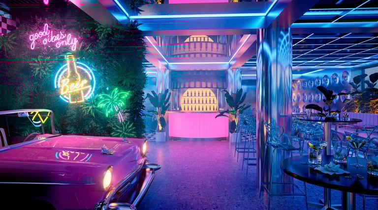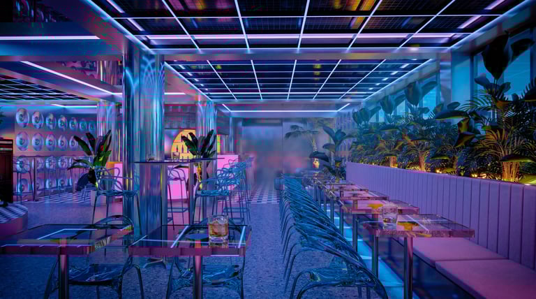 Este bar de 150 m² se concibe como una reinterpretación contemporánea del imaginario Miami Vice, donde la estética vibrante de los años 80 no se replica literalmente, sino que se recompone desde una mirada arquitectónica sensorial y atmosférica. El proyecto no busca ser un set temático, sino un espacio inmersivo donde la luz, los materiales y la composición construyen una narrativa nocturna cargada de nostalgia sofisticada.