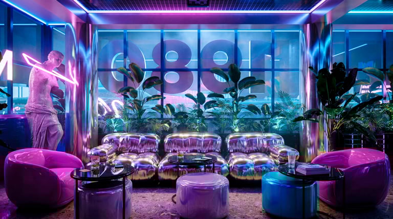 En conjunto, el proyecto logra trascender la nostalgia superficial para construir una experiencia espacial coherente, donde cada decisión —desde la escala hasta el color— responde a una intención clara: reinterpretar los 80 desde la contemporaneidad, transformando el bar en una escena viva, cinematográfica y emocionalmente evocadora.